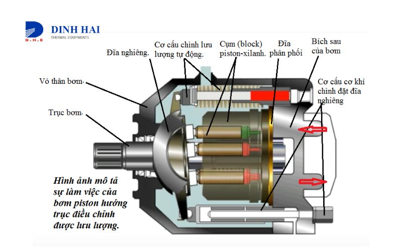 Bơm piston hoạt động nhờ chuyển động tịnh tiến của piston để nén và đẩy dầu ra ngoài.